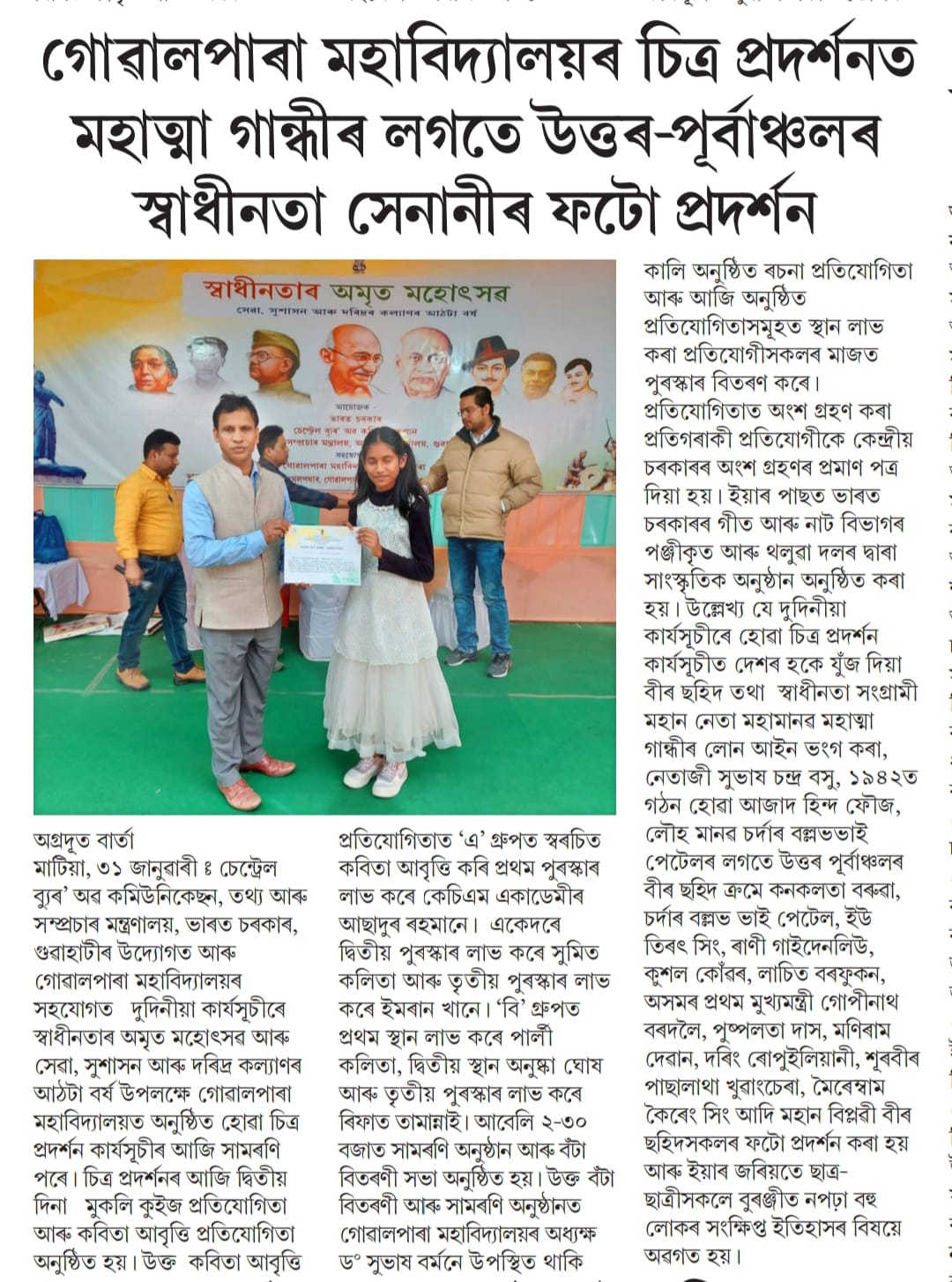 | দৈনিক অগ্ৰদূত jpg 2023 | গোৱালপাৰা মহাবিদ্যালয়ৰ চিত্ৰ প্ৰদৰ্শনত মহাত্মা গান্ধীৰ লগতে উত্তৰ -পূৰ্বাঞ্চলৰ স্বাধীনতা সেনানীৰ ফটো প্ৰদৰ্শন | 270.86 kB | JPEG | ![]() View/Open |